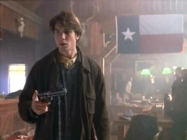 A boy named Jamie finishes practicing his fast draw in time to see Maximillian Arturo, Quinn, Rembrandt Brown, and Wade Welles emerge from the sliding vortex. Coming "from a world of dust to a world of dung" (in Arturo's words), the Sliders are directed to the Wall Street Saloon to get something to eat. They find that this world's San Francisco is part of the Republic of Texas, an amalgam of the real state of Texas and areas to its north and west. Quinn steps in to prevent a fight between two saloon patrons and is drawn into a gunfight with one of them, which he wins by shooting him dead. Quinn is arrested, but Billy Ray, an associate of the Drexel-Bullock Corporation, has him released into his custody. Quinn's offered a position by Mr. Bullock, for the man he'd shot was one of his best lawyers—a gunfight is the method of settling legal disputes in the Republic of Texas.